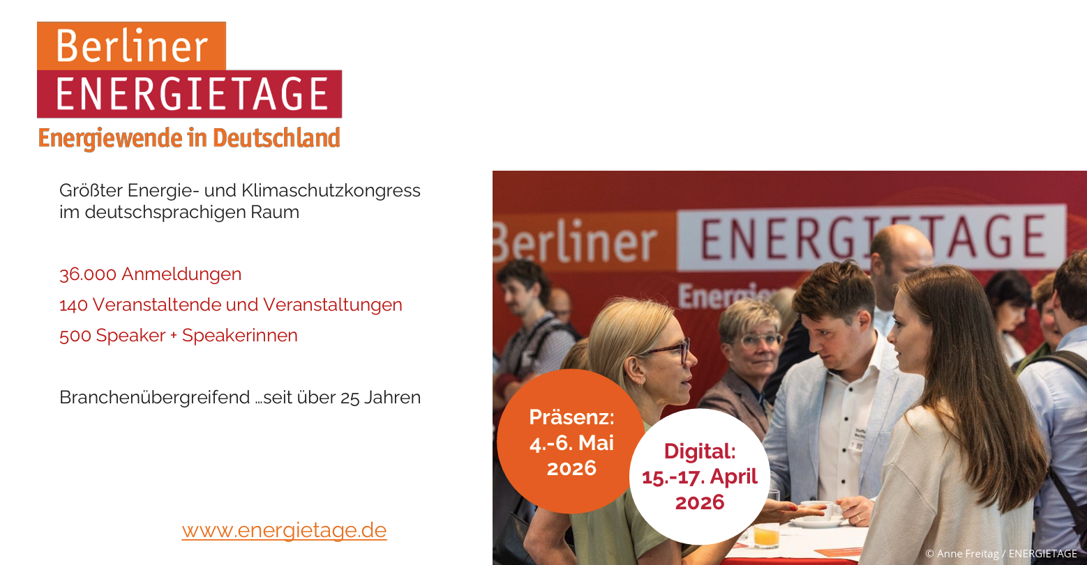 Mai 202604 Mai 2026 Berliner Energietage in PräsenzBerliner Energietage in PräsenzDatum: Mai 4 - 6, 2026Zeit: 8:00 - 17:00Details